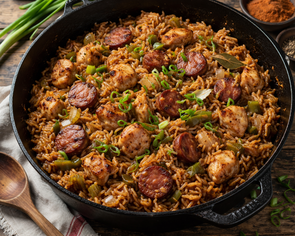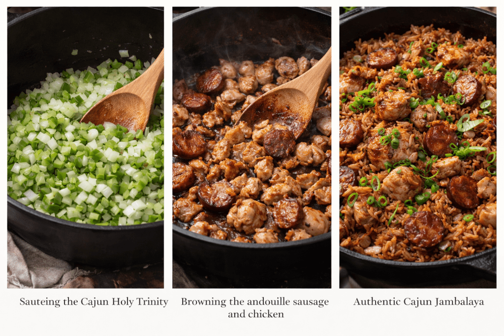 Unlike Creole jambalaya, Cajun jambalaya does not use tomatoes. Instead, it builds deep flavor by browning the meat and cooking the rice directly in the pot with the spices and broth.